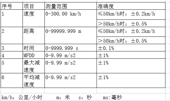 制動試驗(yàn):制動初速、制動距離、制動時(shí)間、協(xié)調(diào)時(shí)間、最大減速度、平均減速度、MFDD(充分發(fā)出的平均減速度)